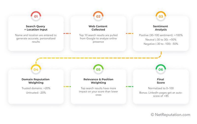 How is your online reputation score calculated? A wide range of online factors play a role in calculating the score. Data that’s accessible online is evaluated by a complex Google Search algorithm to determine the score. Data may include: